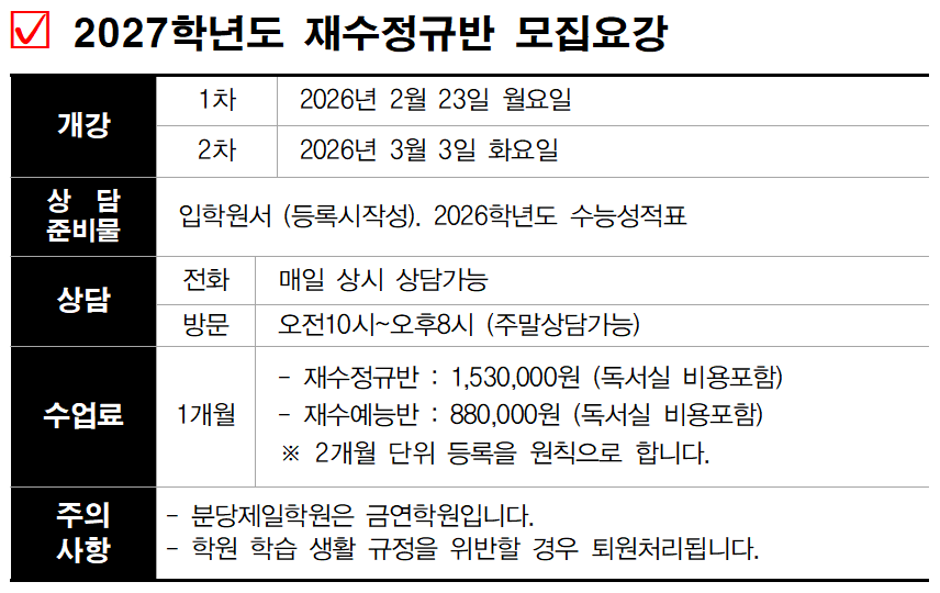 26년 3월 3일(화) 재수종합반 모집상담