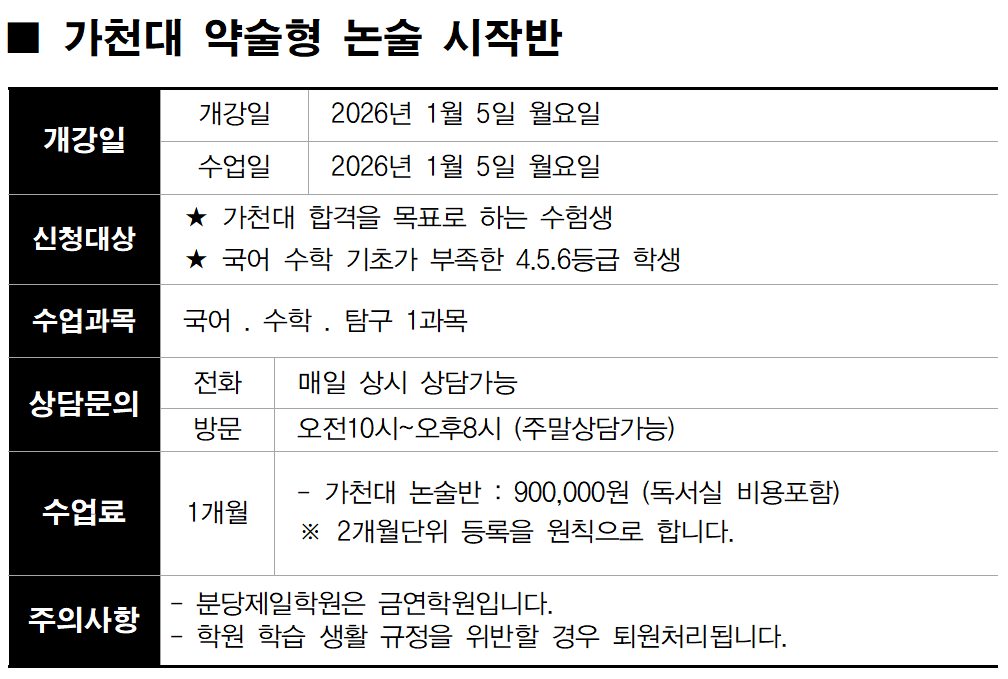 27학년도 가천대 약술형 논술 100% 합격 프로젝트를 시작합니다.